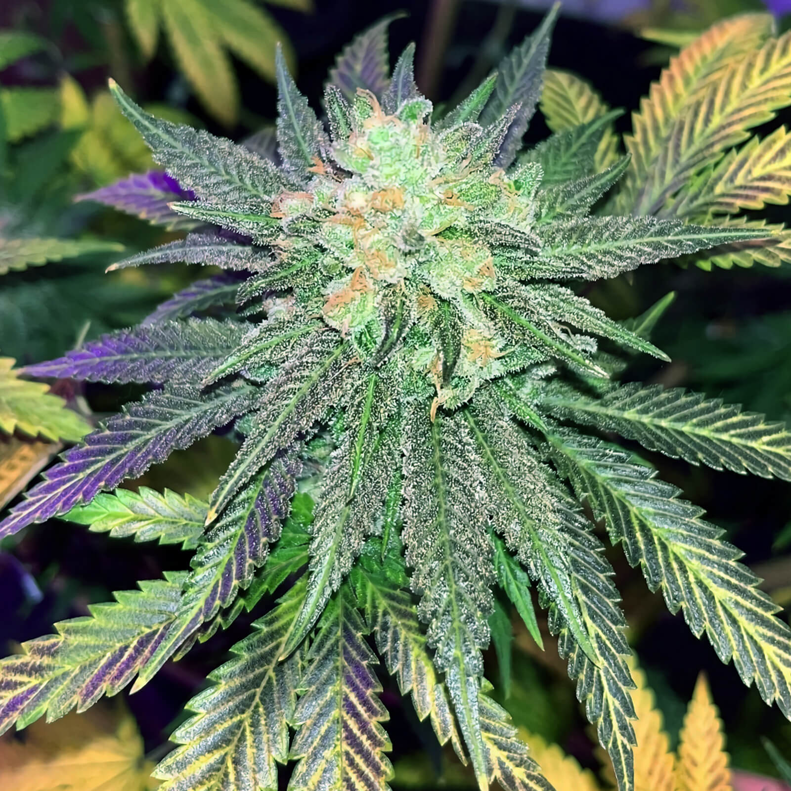 Las semillas de Cherry Pie garantizan plantas robustas y compactas. Sus cogollos son un espectáculo visual, densos y gruesos, adornados con vibrantes pistilos anaranjados y toques de púrpura, una herencia de su progenitor Granddaddy Purple. Las flores están cubiertas de una capa brillante de tricomas, dándoles una apariencia escarchada que promete una rica experiencia en resina.