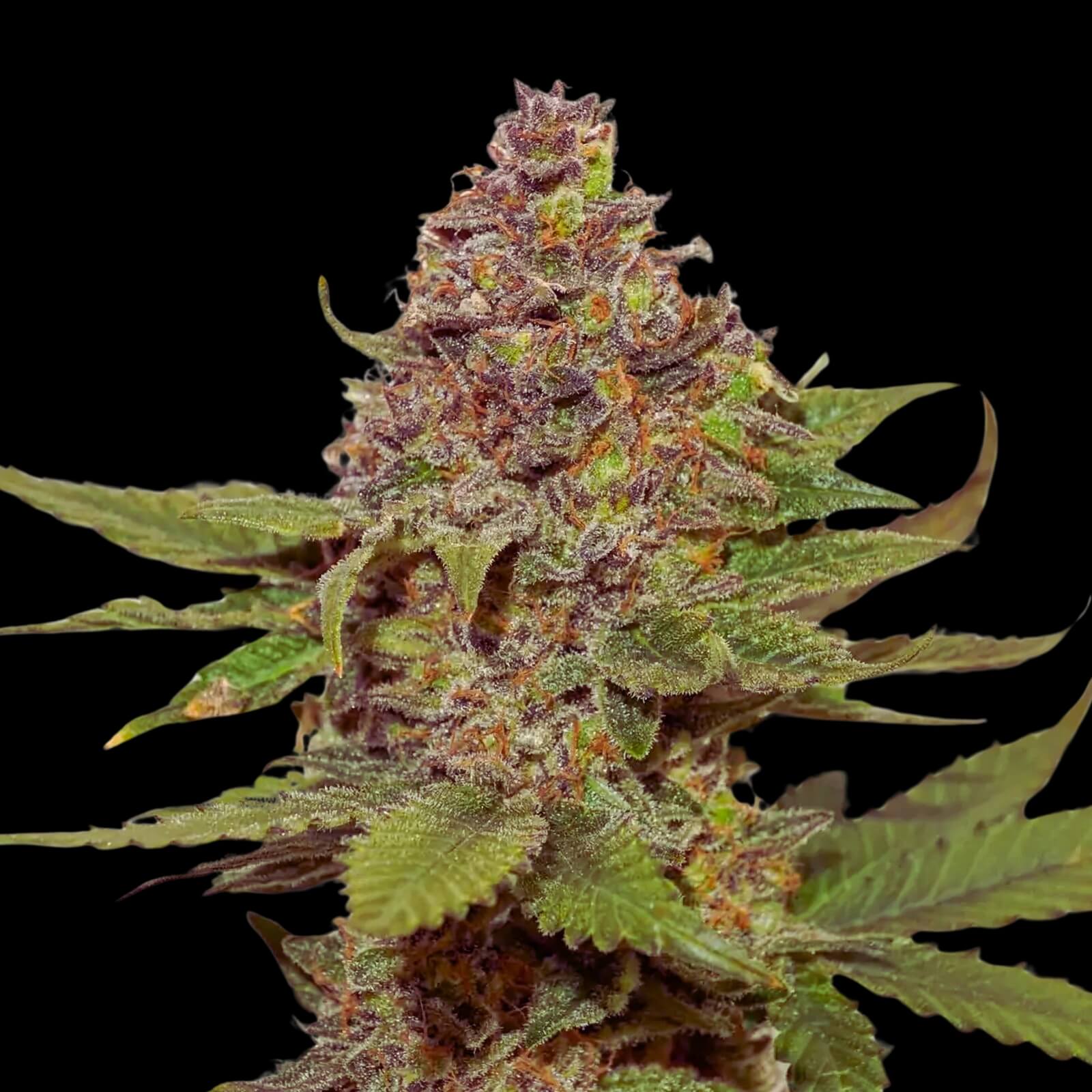 Los colores de Strawberry Cough son otro de sus grandes atractivos. Los cogollos, que pueden mostrar tonos púrpuras y rojizos en algunos fenotipos, contrastan de manera espectacular con las hojas de un verde profundo, creando un espectáculo visual que es tanto un placer para los ojos como para el corazón de cualquier cultivador. Además, estos cogollos tienen una estructura compacta pero menos propensa al “fox-tailing” que otras sativas, lo que facilita su manejo y poda.